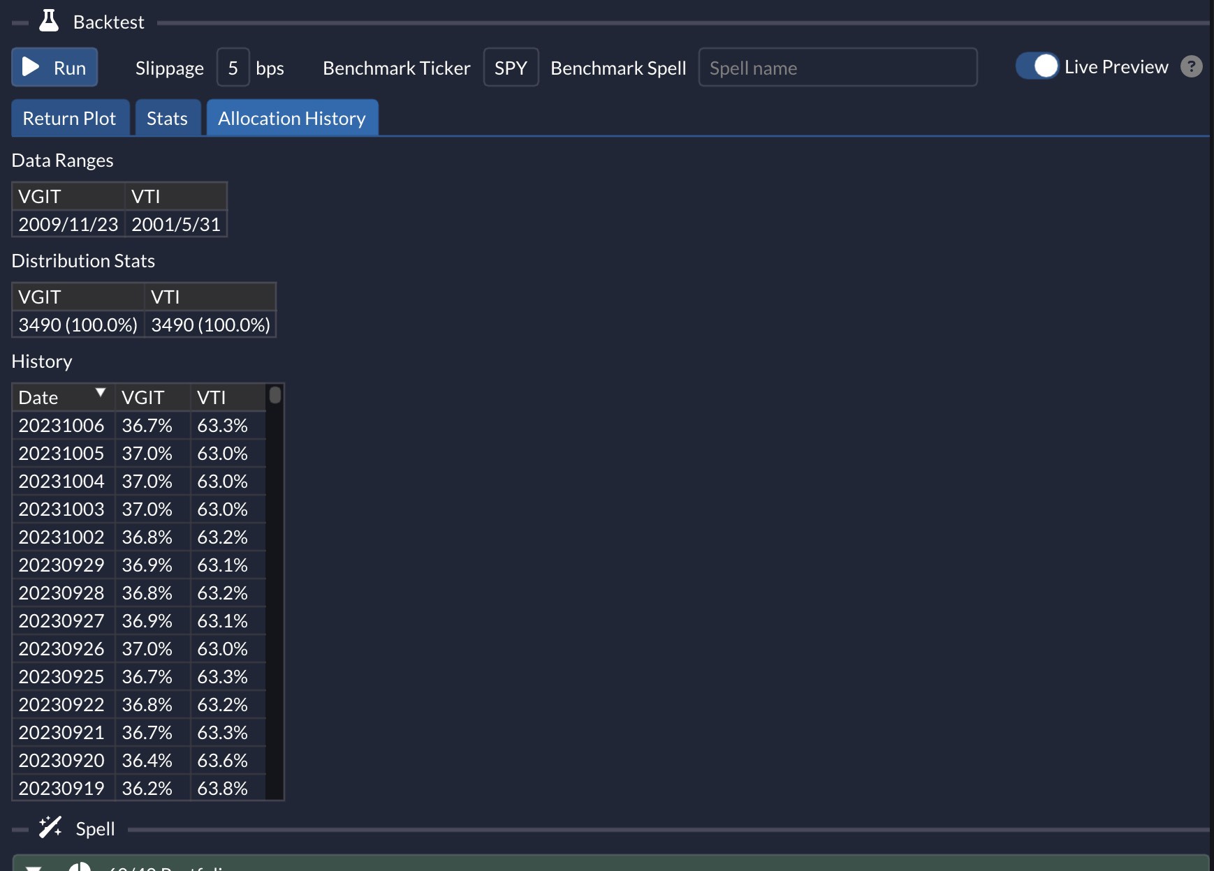 Backtest’sRunbutton is now ready to roll? Give it a click. - Voilà! A snazzy graph showcasing your spell’s journey over time. You can even stack it up against our default benchmark ticker, SPY.